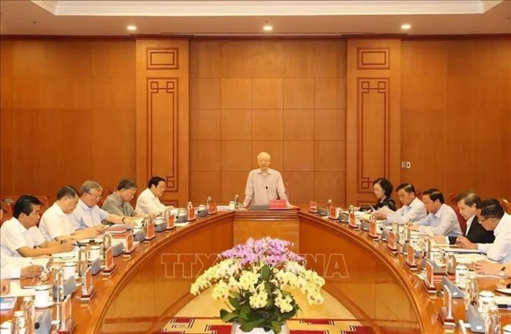 | Le secrétaire général Nguyên Phu Trong prononce un discours à la réunion de la permanence du Comité central de direction de la prévention et de la lutte contre la corruption et les pratiques malsaines, le 10 mai 2022, à Hanoï. |