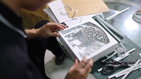 Avant de fabriquer un produit, Duy doit conceptualiser, concevoir, mettre en place la scène d'arrière-plan et organiser les couches de papier sur un ordinateur. Il découpe ensuite méticuleusement les dessins, qui doivent être imprimés à la main sur du papier d'art afin d'assurer la précision du produit final. Après la découpe, les couches de papier sont attachées les unes aux autres pour créer une image complète. Chaque couche doit être soigneusement choisie afin que sa qualité d'origine soit maintenue, sans rétrécissement, étirement ou plissement dû à la température ou à un taux d'humidité défavorable.