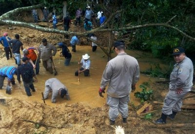| Des pompiers et des habitants recherchent des victimes des inondations à Villa Santa, dans le département d'El Paraiso, le 21 octobre 2016 au Honduras. |