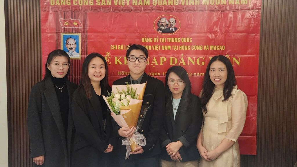 | Nguyên Thi Xuân Huê (2e à gauche), doctorante en linguistique appliquée de l'anglais à l'Université de Macao (Chine), lors de la cérémonie d'admission de nouveaux membres au Parti. |