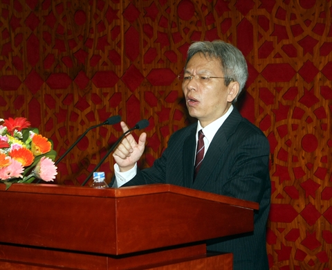 | Le chef adjoint du Bureau de l'Assemblée nationale, Nguyên Si Dung, prend la parole à la "séance plénière" de l'organe législatif avec la participation d'étudiants jouant le rôle de députés, le 13 mars à Hanoi. |