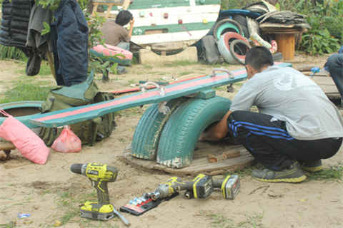 | Des membres de Think Playgrounds font des balançoires à partir des vieux pneus. |
