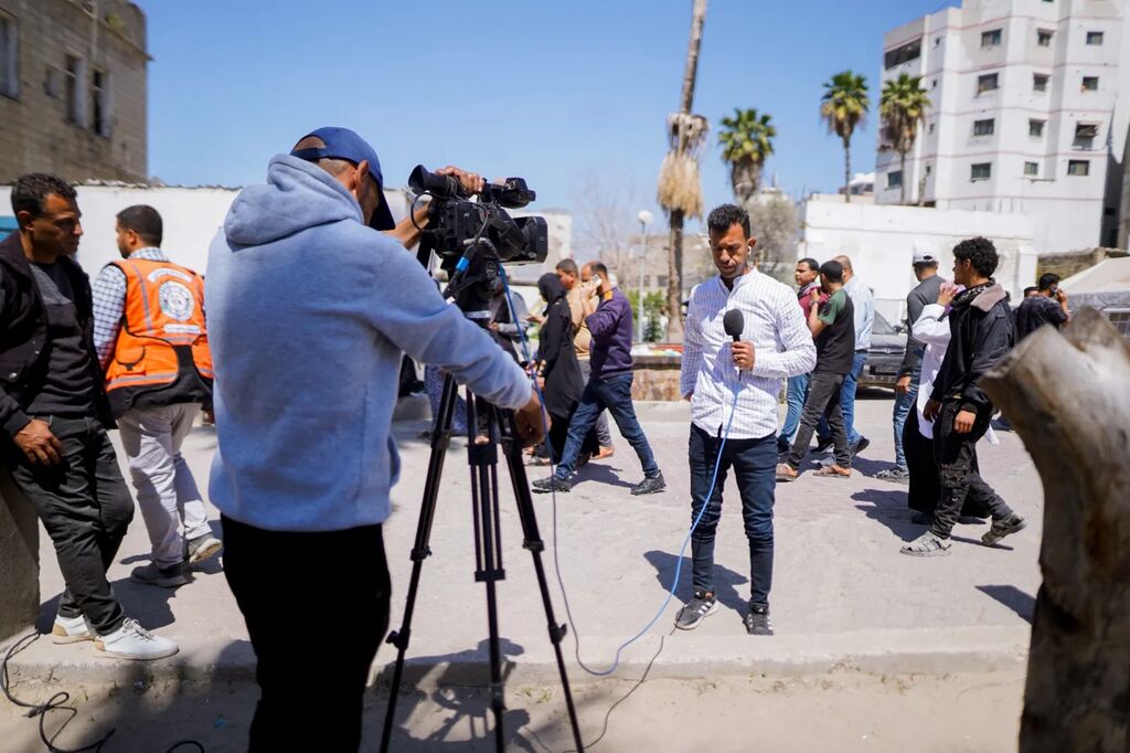 | Des journalistes dans le Nord de Gaza, le 4 avril 2025. |