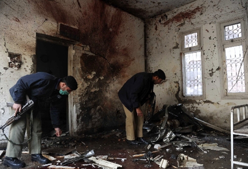| Des policiers inspectent un commissariat détruit par les trois kamikazes, le 24 février à Peshawar dans le Nord-Ouest du Pakistan. Photo : AFP/VNA/CVN |