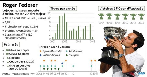 | Portrait et statistiques du joueur de tennis Roger Federer qui vient de remporté son 6e Open d'Australie et son 20e titre en Grand Chelem. |