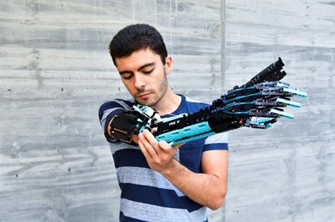 | David Aguilar montre sa prothèse d'avant-bras droit qu'il a lui-même construite en Lego, le 9 septempbre à Sant Cugat del Valles, près de Barcelone. |