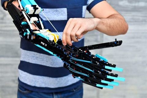 Et aujourd'hui, il présente fièrement la cinquième version de sa prothèse, la MK5, un bras en Lego d'aspect robotique avec des barres bleues faisant office de doigts que David active d'un mouvement de son moignon, grâce à un système de poulies motorisées.