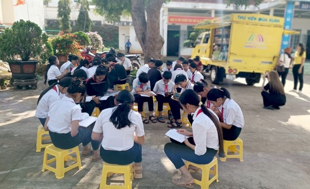 Dans l’enceinte du collège Tô Vinh Diên, sous les feuillages, un groupe d’élèves lisent à côté d’un camion jaune baptisé "Librairie du printemps". La chaleur accablante, le chant bruyant des cigales et le brouhaha des alentours semblent n’avoir aucun effet sur leur concentration.