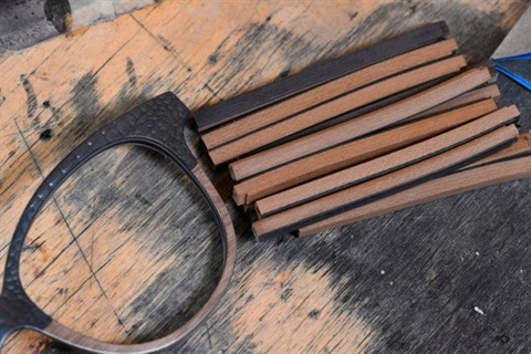 Des feuilles de bois découpées puis plaquées avec un jeu de couleurs et de textures avant d'être soigneusement polies et vernies, les montures prennent vie en passant par les mains expertes d'une vingtaine de salariés. Certaines allient le bois au titane ou à l'inox.