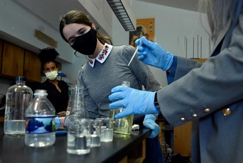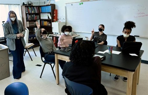 | Rebecca Bushway (gauche), professeure de Sciences, et ses élèves du lycée de Silver Spring, le 21 avril dans le Maryland. |
