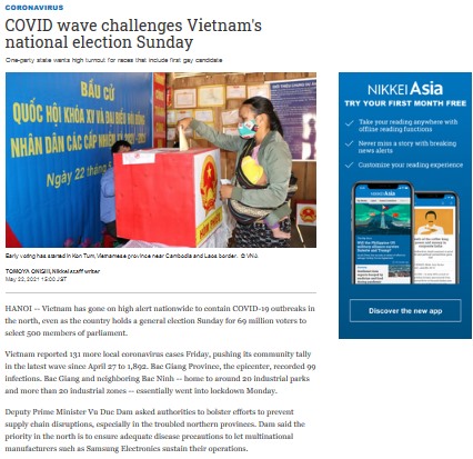 Le même jour, l'Agence de presse japonais Kyodo News a également rapporté que le Vietnam avait organisé des élections de l'Assemblée nationale tout en prenant des mesures de prévention et de lutte contre de COVID-19 alors que le nombre de nouvelles infections augmentait. Dans les bureaux de vote, des mesures de prévention épidémique sont strictement appliquées comme la prise de la température corporelle, la distance et le port de masques.