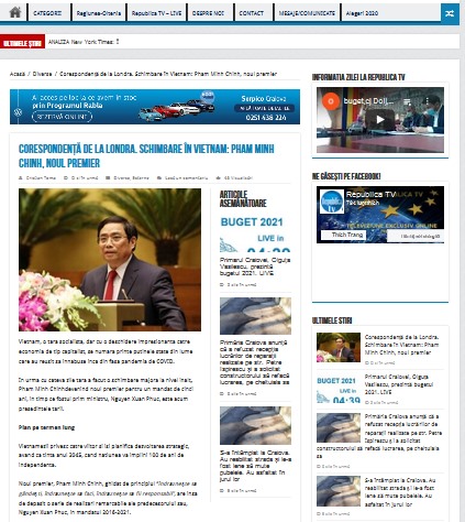 De grands journaux et agences de presse, dont Agerpres, Romaniatv.net, Republicatv.ro, Proarges.ro, Digi24.ro, Stirileprotv.ro, ont affirmé que la nouvelle équipe dirigeante au Vietnam hériterait des réalisations impressionnantes au cours du dernier mandat et créerait de nouveaux développements, en promouvant l'amitié Vietnam - Roumanie.