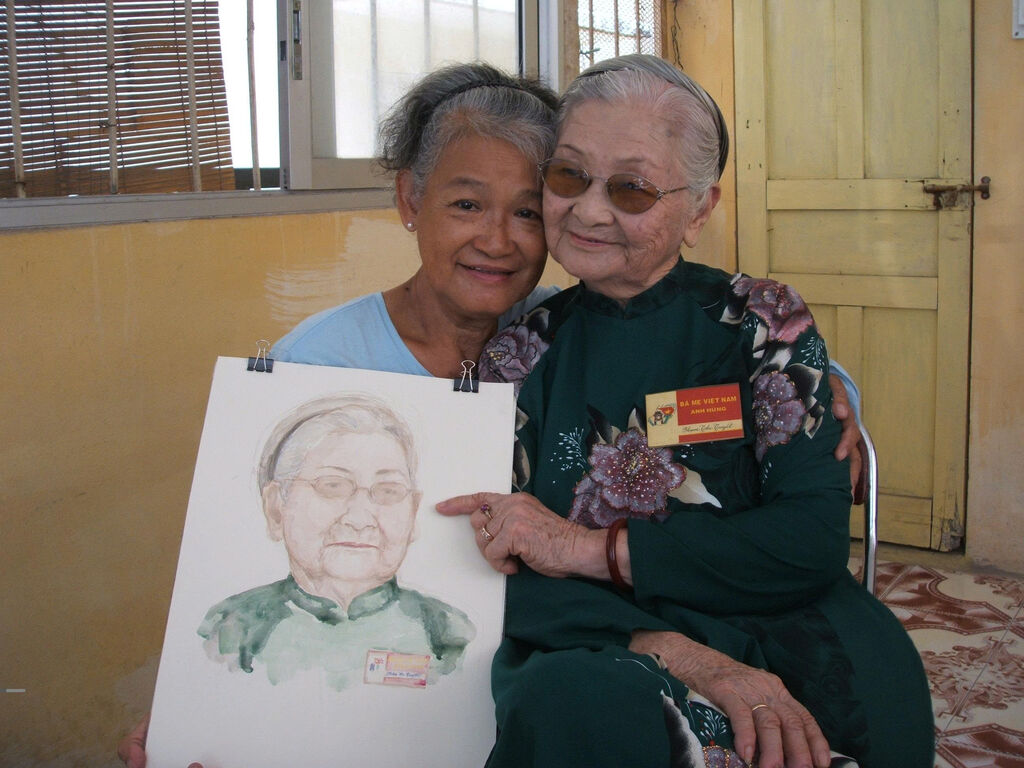 | La peintre Dang Ai Viêt (gauche) et la Mère Héroïne Pham Thi Tuyêt. |