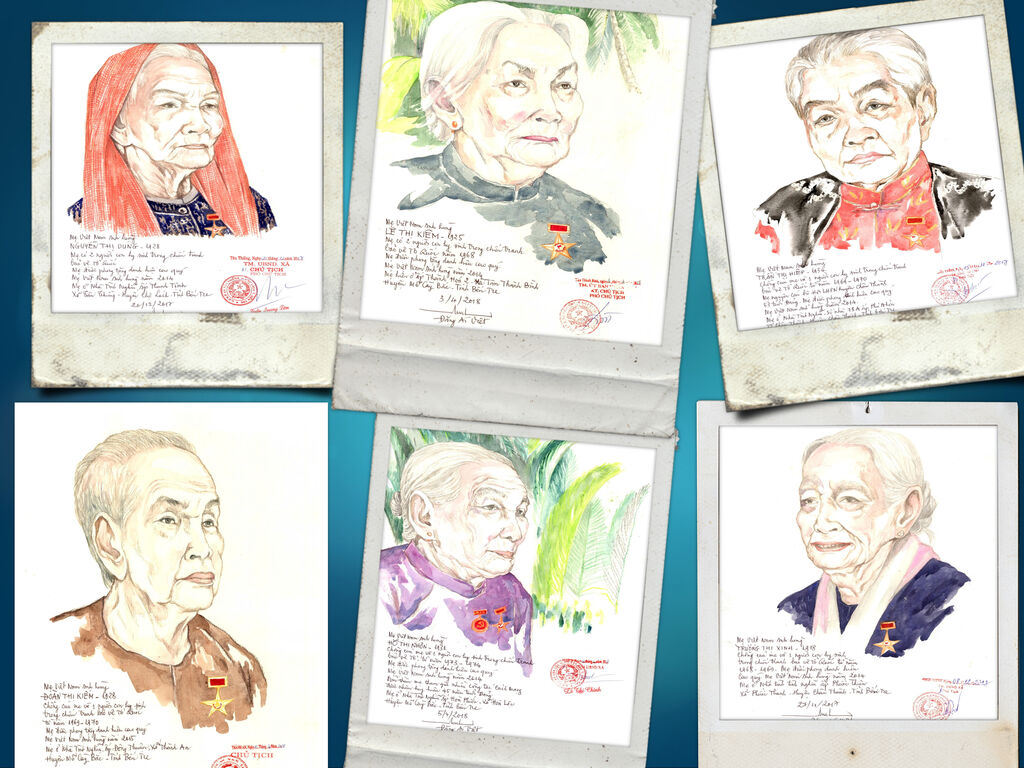 | Portraits des Mères Héroïnes signés Dang Ai Viêt. |