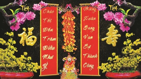 Les trois personnes incarnent les trois génies Phúc, Lôc et Tho - Bonheur, Prospérité et Longévité - arrivent dans une maison pour prononcer des paroles élogieuses.