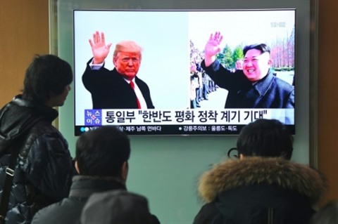 | Une chaîne de télévision sud-coréenne rapporte l'annonce historique d'un sommet entre Donald Trump et Kim Jong Un, le 9 mars à Séoul, en République de Corée. |