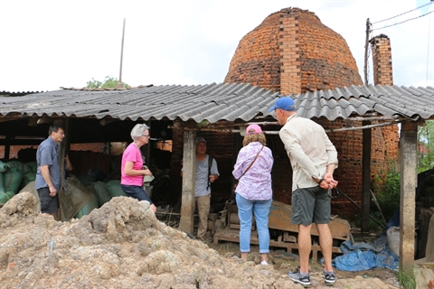 | Touristes occidentaux dans un four à briques de l’époque coloniale française, dans la province de Bên Tre |