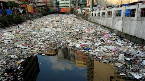 | Des immeubles se reflètent dans l'eau d'une rivière polluée par des déchets plastiques au coeur de Manille aux Philippines, le 23 janvier 2016. |