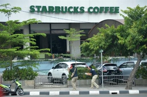| Des policiers indonésiens devant un café Starbucks après une série d'explosions dans le centre de Jakarta et des coups de feu, le 14 janvier. |