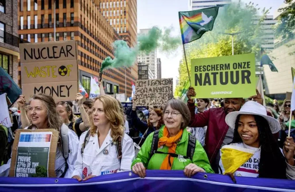 Le cortège incluait des membres de Greenpeace, d'Extinction Rebellion et de Milieudefensie, branche néerlandaise des Amis de la Terre, ONG à l'origine de la procédure qui a abouti à une décision de justice en 2021 ordonnant au géant pétrolier anglo-néerlandais Shell de réduire ses émissions de gaz à effet de serre.