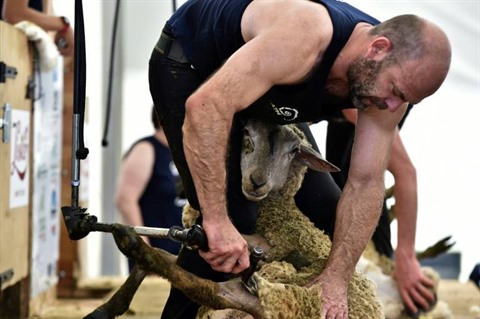 | Un compétiteur procède à la tonte d'un mouton lors de la compétition des 24 heures de tonte à Coulonges (Ouest). |