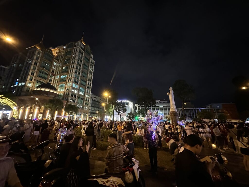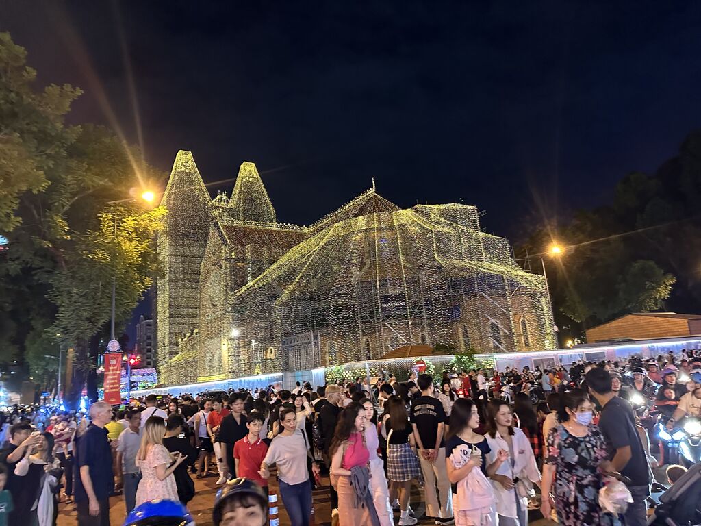 | La place de la Cathédrale Notre-Dame de Saigon envahie par des milliers de personnes célébrant Noël et faisant la messe. |
