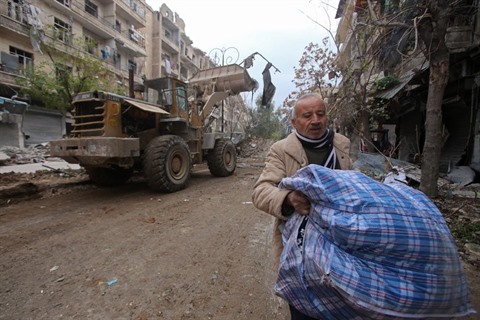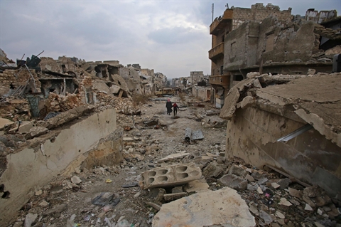 | Des Syriens traversent une rue détruite du quartier d'al-Akroub d'Alep, le 17 décembre. |