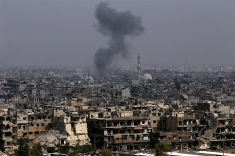 | De la fumée au-dessus des quartiers sud de Damas, le 28 avril. |