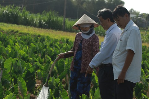 Dans le hameau de Giong Lon A, commune de Dai An, district de Tra Cu, à côté des rizières d’hiver-printemps qui viennent d'être récoltées, se trouvent les champs de taro qui sont en train de pousser. Ici, l'ambiance de travail est extraordinaire et chacun est à son poste. Le taro est une plante qui s’adapte bien au sol de cette région. Très appréciée par les gens du coin, elle permetaux agriculteurs d’origine khmère de sortir de la pauvreté en gagnant un salaire stable.
