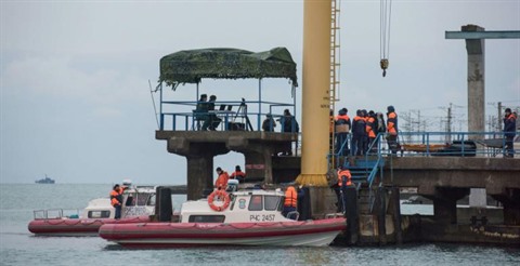 | Des sauveteurs russes sur une plate-forme en mer Noire, le 26 décembre à Sotchi |
