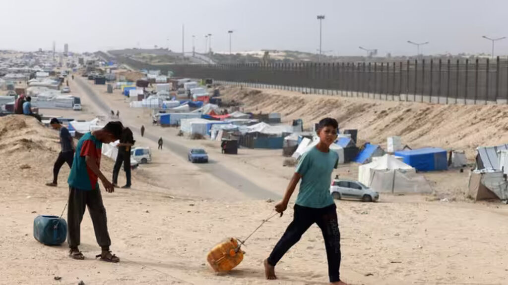 | Des enfants traînent des bidons remplis d'eau jusqu'à leur tente en bordure de Rafah, le 26 avril 2024. |