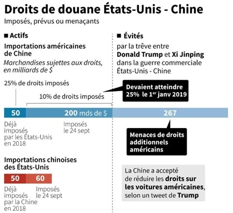 | Droits de douane États-Unis - Chine et aménagements suite à l'accord entre les deux pays lors du G20. |
