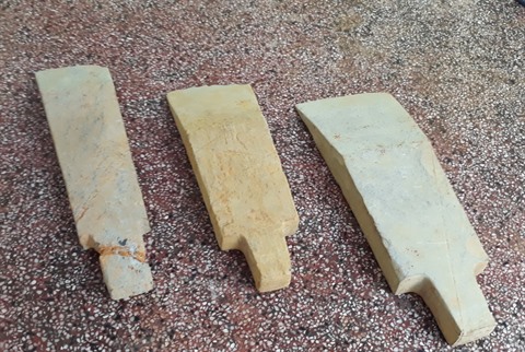 | Les trois objets en pierre en forme de houe, datés de 3.000 ans, trouvés dans la province de Binh Phuoc (Sud). |