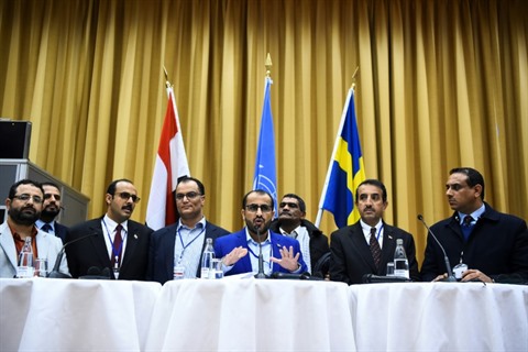 | Le chef de la délégation des rebelles Houthis aux pourparlers de Suède, Mohammed Abdelsalam, lors d'une conférence de presse en marge de ces consultations, le 13 décembre. |