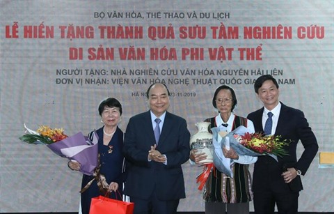 Le Premier ministre Nguyên Xuân Phuc a participé à une cérémonie de remise des ouvrages d’étude et de collecte de patrimoines culturels immatériels réalisés par le chercheur en culture traditionnelle Nguyên Hai Liên, à l'Institut national de la culture et de l’art, juste à l’occasion de la Journée nationale du patrimoine, le 23 novembre.