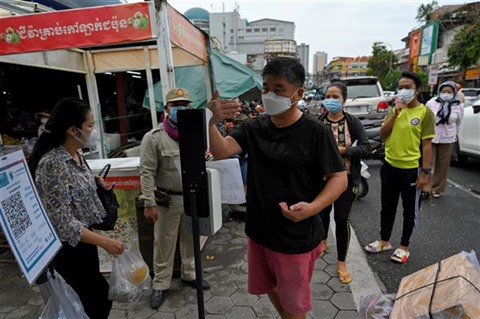 | Mesure de la température corporelle avant d'entrer dans un marché à Phnom Penh, au Cambodge. |