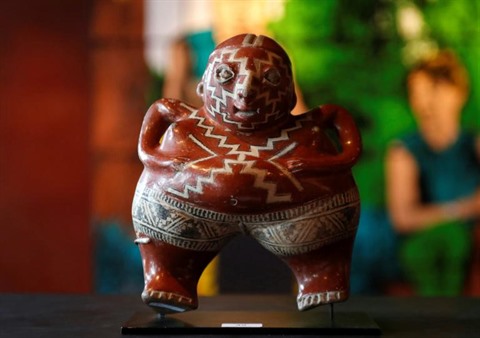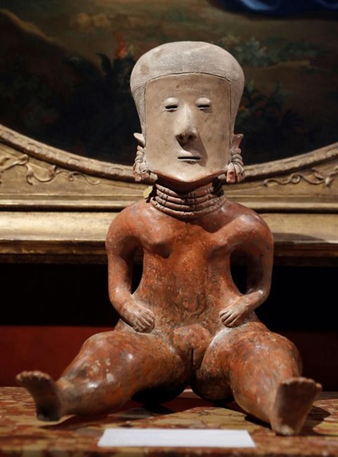 | Une sculpture Nayarit datée entre 100 avant JC et 250 après JC exposée le 23 mars à Paris. |