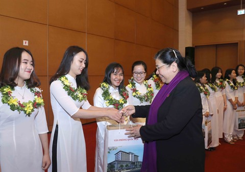 | La vice-présidente permanente de l’Assemblée nationale, Tong Thi Phong (droite), et les jeunes étudiantes talentueuses. |