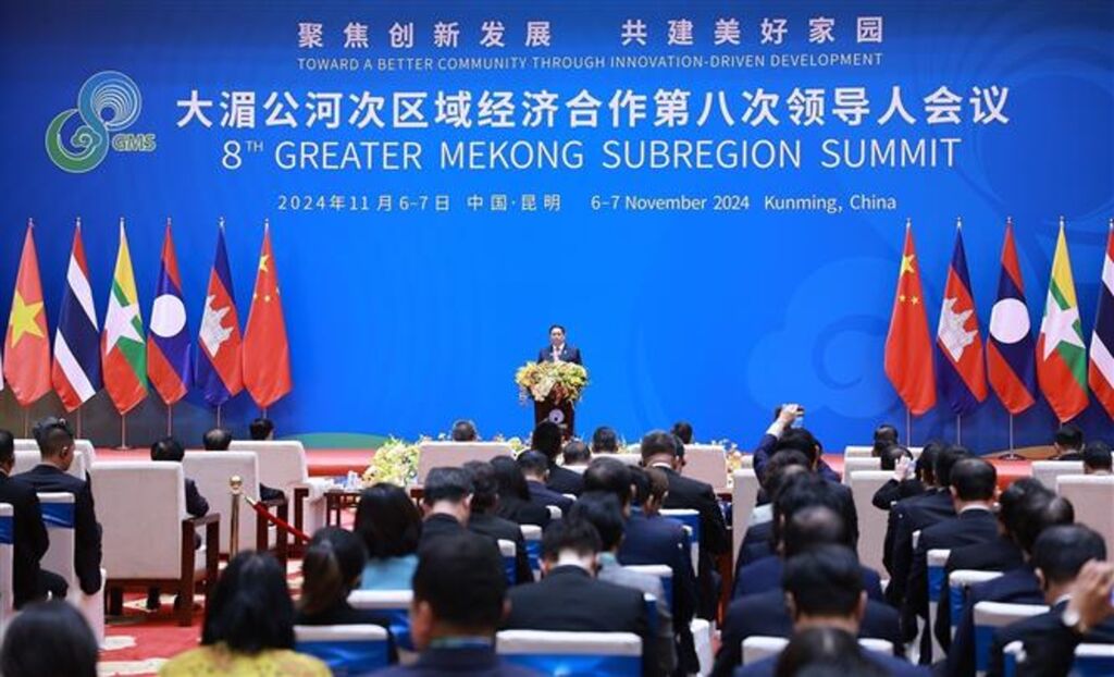 | Le Premier ministre Pham Minh Chinh prenant la parole lors du VIIIe Sommet de la sous-région du Grand Mékong (GMS-8), ouvert jeudi 7 novembre dans la ville de Kunming, en Chine. |