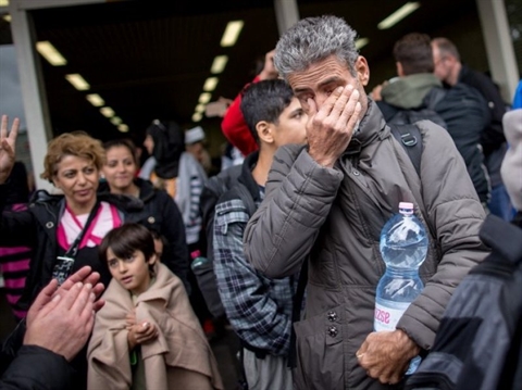 | Un réfugié n'arrive pas à retenir ses larmes devant l'accueil de volontaires allemands à son arrivée en gare de Dortmund |