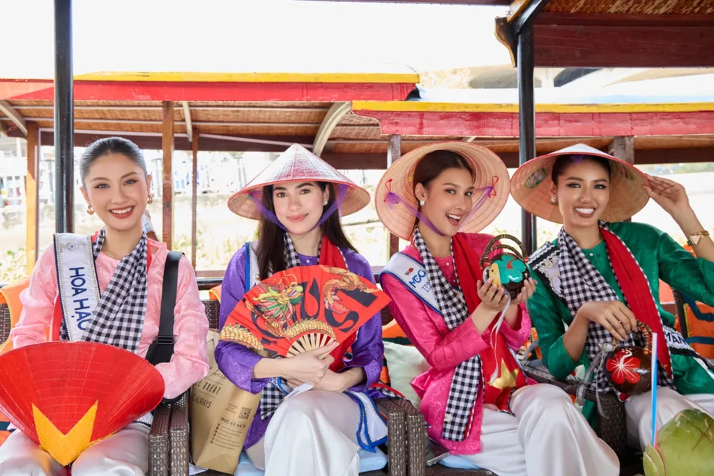 | Des reines de beauté internationales en immersion touristique dans le Delta du Mékong. |