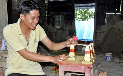| Nguyên Van Sinh, un habitant de la province de Kiên Giang (Sud), aime toujours autant fabriquer des modèles de ces bornes frontalières en terre cuite. |