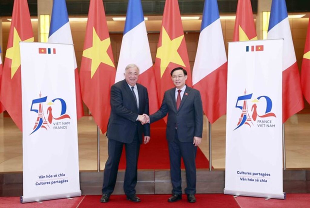 | Le président de l'Assemblée nationale, Vuong Dinh Huê et le président du Sénat de France, Gérard Larcher, à la cérémonie de lancement des événements commémorant le 50e anniversaire de l'établissement des relations diplomatiques entre le Vietnam et la France à Hanoï, le 8 août 2022. |