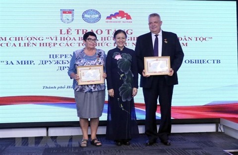 | Trois responsables russes de Hô Chi Minh-Ville ont reçu l'insigne «Pour la paix, l'amitié entre les nations» par l'Union des organisations d'amitié du Vietnam, |