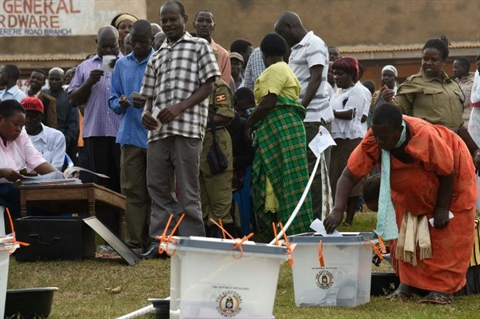 | Des Ougandais en file d'attente pour voter le 18 février à Kampala. |