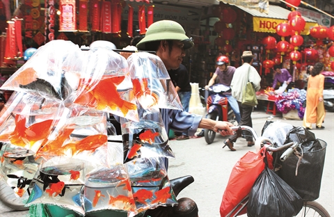 | Des carpes rouges sont vendues dans les rues. Photo : Anh Tuân/VNA/CVN |