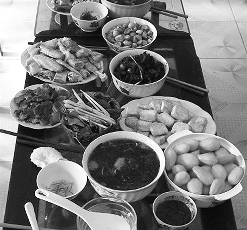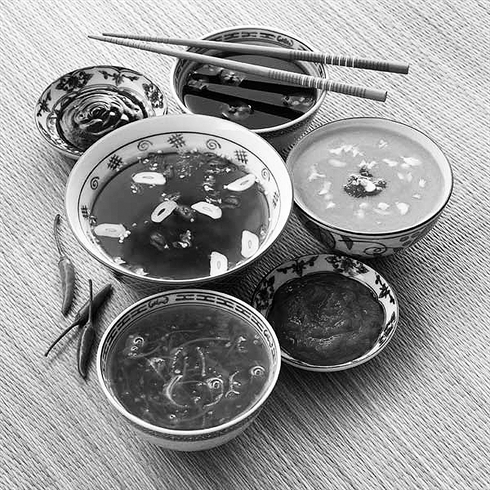 Les seuls objets individuels sont la paire de baguettes et le «bát», ce petit bol qui remplace l’assiette. Pour le reste, tout est collectif, et présenté en une seule fois sur la table. Sauf le riz, bien tenu au chaud dans sa marmite de cuisson, qui reste hors de portée. C’est la maîtresse de maison qui en assure la distribution au fur et à mesure des besoins. À côté du saladier ventru qui contient le «canh», potage cuisiné, s’éparpillent les gros bols de viande, poisson, légumes, et les inévitables petites coupelles qui sont là pour titiller nos papilles. Car la coupelle est au repas vietnamien ce que la fourchette est au repas occidental : indispensable. Tout simplement parce que ce petit accessoire, qui ressemble à une tasse de dînette à poupée, est destiné à contenir ce qui donne du caractère aux aliments : les sauces !