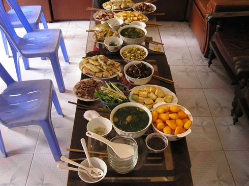 Ici, à côté du plat de viande bouillie, on trouve la coupelle de «nuoc mam» (saumure de poisson). C’est certainement la sauce la plus connue en Occident de nos jours. Issue de la fermentation de poisson dans du sel, elle dégage une odeur véritablement pestilentielle pour un nez Tây (étranger) non averti ! Je me souviens en avoir subit les effets indirects dans mon enfance. À cette époque, dans mon quartier parisien, c’était plutôt l’odeur du boudin purée ou du poulet frites qui filtrait sous les portes de cuisine. Les restaurants vietnamiens en étaient encore à l’état expérimental, et les rayons des premiers supermarchés n’exposaient pas encore les produits made in Vietnam à l’époque d’un Têt que tout le monde ignorait…