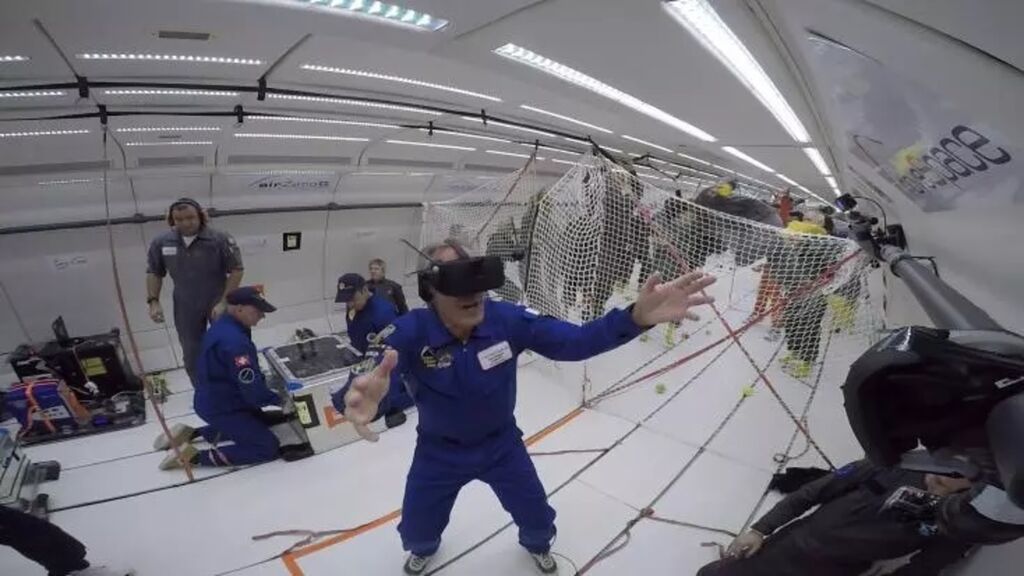 | Photo de Novespace montrant des expériences en cours dans l'Airbus A310 Zéro-G, avec son président et spationaute Jean-François Clervoy muni d'un casque de réalité virtuelle, le 22 octobre 2016. |