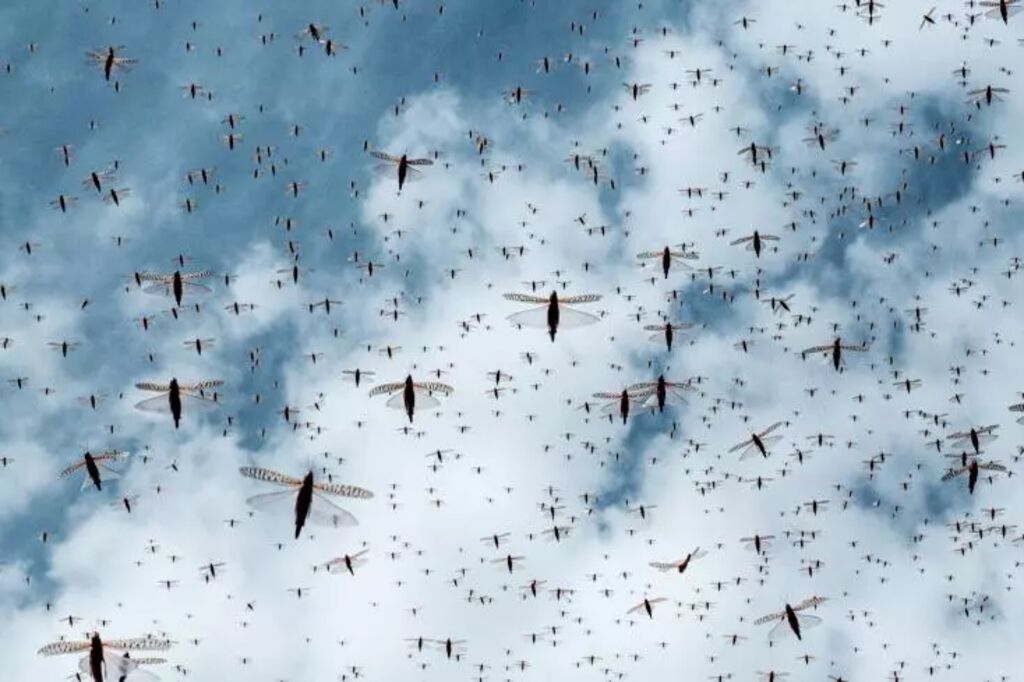 | Un essaim de criquets pèlerins après qu'un avion a pulvérisé des pesticides à Meru, au Kenya. |